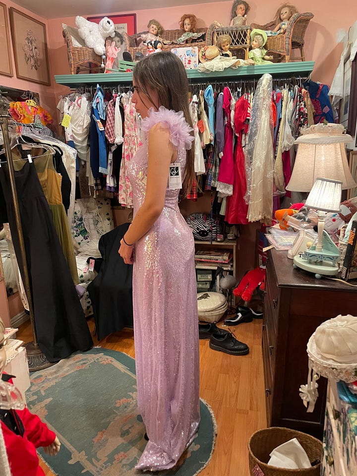 You send pictures to your mother. She likes the one that is purple and prom-ish with sparkles, possibly because it makes you look innocent. You tell her it’s not your style. You’re glad she’s 3,000 miles away and unable to sway you. You think that this is part of what it means to grow up: to choose the dress she didn’t favor.