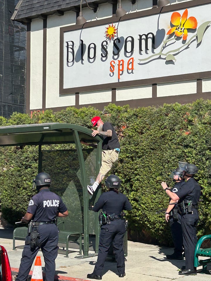One suited man tells you the police aren’t letting anyone through. You say that if they aren’t allowed to touch the protestors, then they can’t touch you either. You see a gap and you walk through it. You are now walking alone in the middle of Highland Avenue. A golf cart carrying a withered celebrity speeds by you but doesn’t stop. Eventually you flag one down. When you get to the carpet, there is no one there besides a fleet of staff.