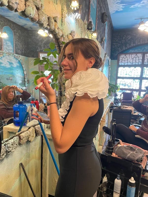 Hair done, you parade your two outfits for the small group gathered in the salon. There is a vote. You go with the white puff black dress, and do your own makeup with $5 worth of drugstore products as the Uber makes its way.